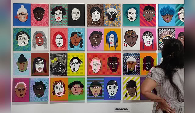 In addition to these accessories, Vanessa had also imagined stories for all of her 100 women. These are made apparent in the background of the frames that these faces occupy. “Initially, I had wanted to leave them all plain. But then I started playing around with them. I thought, here’s an element that could give more information to the viewer,” Vanessa says. In a few lines, strokes or letters, she also managed to depict the socio-cultural settings that trap the inhabitants of her frame.