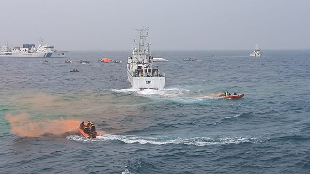 A sea exercise conducted roughly 10 nautical miles off the Kochi coast simulated a series of strategies to address maritime incidents. These included managing onboard fires, identifying and intercepting suspicious vessels, and conducting coordinated search and rescue operations.