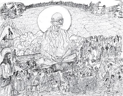 For an artist who spoke a lot about various topics, he rarely mentioned his works, they say. The Buddha, Gandhi, Sufi saints, velichappadu (oracle), a mother figure resembling the Madonna, a clown, and theatre are a few familiar symbols that appear in his series.