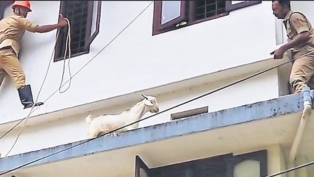 The goat was stuck on the second floor of the building which houses five families. When the Eloor fire and rescue team arrived, the goat turned aggressive and tried to butt the rescuers. It also moved around the sunshade, adding to the challenge. Eventually, the team managed to tie and secure the goat with a rope and bring it down safely. The operation took nearly half an hour.