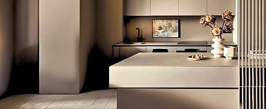 Think cabinetry, backsplashes, island counters. Mocha mousse adds warmth, making the space welcoming and following the in-vogue scheme of colours. Kitchens with mocha mousse when paired with white quartz countertop, keeps the space light and modern. Brushed brass and black hardware can also be added to create the required edge.