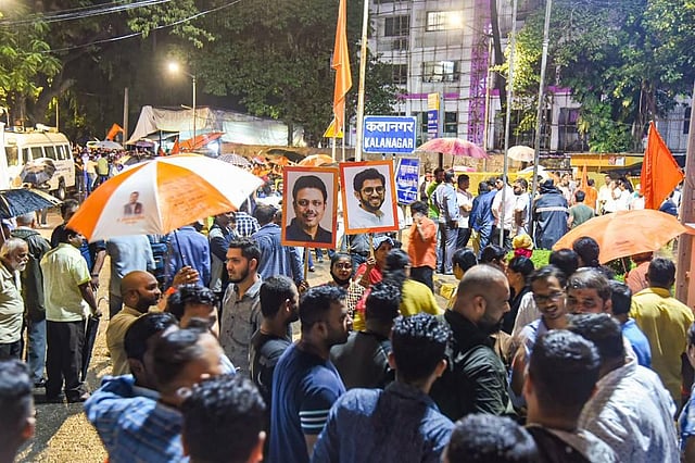 On Thursday, angry Shiv Sena supporters blackened a photograph of Mahim MLA Sada Sarvankar, who has joined Shinde's group in Guwahati, on a banner, scribbling `Gaddar' (traitor) across it.