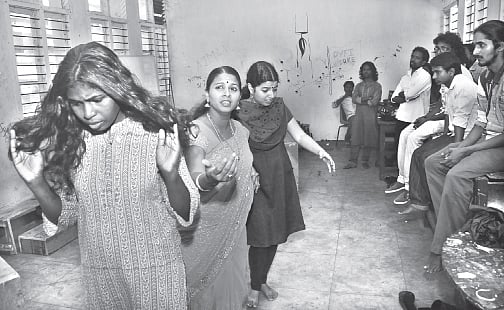 Cobwebs dangled from the corners of the practice room inside the University Student’s centre. On the walls were hand-drawn images of Cheguvera and other revolutionaries. Kalamandalam Raji, Aparna and Remya are enacting the lines. The rest of the team are spell bound as they watch the scene unfold. The lines are from Dr Vayala Vasudevan Pillai’s play, ‘Aandu Bali’.