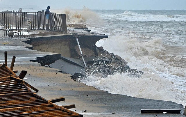 Shankhumukham beach completely disappeared in no time and the road stretching from Shankhumukham to the airport was almost washed away. Only a few metres remain for the sea waves to touch the boundary of the airport. The renovation works carried out at the spot were also wiped out by the giant waves. Minister Kadakampally Surendran visited Shankumukham and reviewed the situation on Sunday. “The government will seriously think about the situation at Shankumukham. Immediate action is the need of the hour,” he told reporters. Many other coastal roads are also on the verge of collapse. Over 100-odd houses situated in coastal regions developed cracks and some houses were completely washed away by the sea.