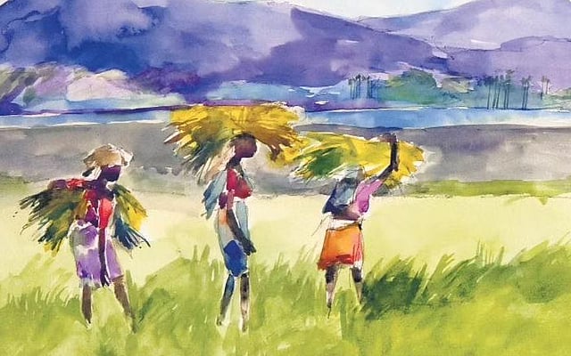 The rustic beauty of South Indian villages, with lush green paddy fields, clear blue skies and mighty mountains as a bacdrop is a common element in a majority of Murali’s paintings, like Paddy and Palm, In Memory of Punchakari and The Fields. He has portrayed portraits of workers on paddy fields extensively, where they are engaged in sowing and harvesting. “The green and forest cover in our state is rapidly declining. It was a saddening sight for me and I wanted to tell this story through my paintings,” he says, adding that the exhibition is a call to conserve nature before it is destroyed beyond repair. Murali is a former professor and chair of English at the Pondicherry University.