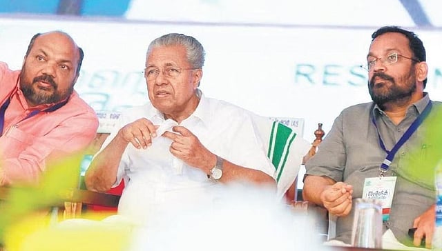 Pinarayi Vijayan and P Rajeeve share a light moment during the inauguration of mega entrepreneurs meet in Kochi on Saturday. Revenue Minister K Rajan is also seen | T P Sooraj