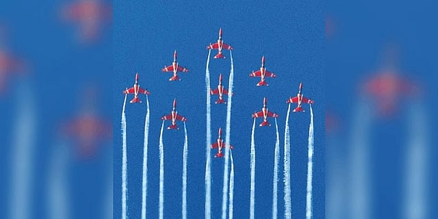The Surya Kiran aerobatics team of Indian Air Force making a formation during the aerobatic display at Shankhumukham on Sunday | B P Deepu