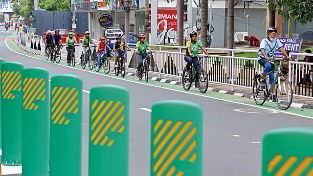 “There are encroachment, parking, police barricades, etc on the track. The width of the lane is insufficient to accommodate safe cycling, especially in stretches where two-way cycling should be possible. I had personally suggested to officials that the cycle lane be incorporated within the pedestrian footpath area, protected by railings, to ensure safety for children, elderly riders, and regular cyclists. This was not considered,” he adds.