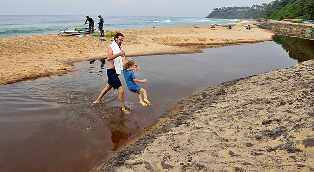 A tourist hauls his daughter out of the dirty, stinking stream of contaminated water flowing on the beach.