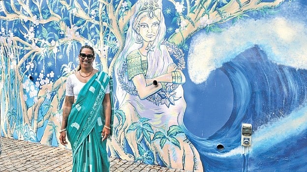 “I used different themes from Kerala and India because they resonate with where I come from. Coming from Réunion Island in the Indian Ocean, I feel a natural link through that shared sea. The woman inside the tree symbolises life, growth, continuity, nature and transmission. For me, it was important to give women visibility in public spaces, to put them in the spotlight. Kerala’s beautiful ocean and trees reminded me of home, so I wanted to bring all these elements together in this artwork,” she says.