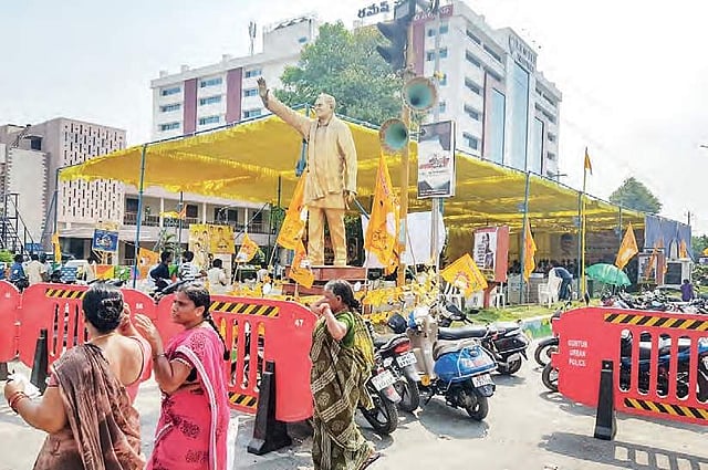 After offering floral tributes to the portraits of Mahatma Gandhi, Potti Sriramulu, Jyothi Rao Phule and BR Ambedkar, he came onto the dais. He was blessed by priests from Tirumala temple, Kanaka Durga temple, elders of Islam, Christian, Buddhist, Sikh and Jain communities.