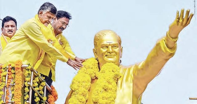 The TDP chief said State government would set up an NTR Memorial and a 75-feet giant statue of the late leader, for which tenders will be called for in June. He stressed the need for introducing Life of NTR as a lesson in the school curriculum. He hailed the decision of his brother-in-law and Hindupur MLA Nandamuri Balakrishna to produce the biopic of NTR and wanted it to be released by Sankranti next year. Balakrishna said he feels proud to produce and act in the biopic of his father.