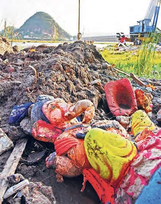 VIJAYAWADA: The city police and Vijayawada Municipal Corporation (VMC) officials ensured that Ganesh idols brought for immersion were only half immersed like last year. Decrying the shabby treatment meted out to the idols during the immersion, devotees said the move hurt their sentiments.