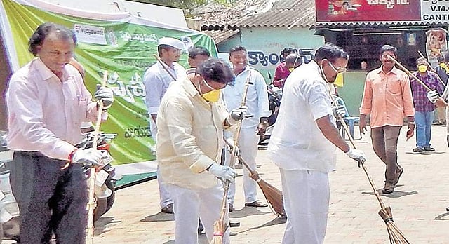 VIJAYAWADA: As part of ‘Swachhta hi Seva’ campaign, Vijayawada Mayor Koneru Sreedhar, accompanied by Chief Medical Officer for Health (CMOH) K Arjuna Rao, swept the premises of municipal corporation office here on Thursday.