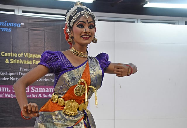 VIJAYAWADA: The audience at the Cultural Centre of Vijayawada and Amaravati (CCVA) witnessed Sruti Samanvi’s mesmerizing Kuchipudi performance on Monday. Disciple of Natyacharya B Sudheer Rao, Samanvi performed Natyasravanti, a series of performances, organised jointly by the CCVA and Srinivasa Farms, aimed at conserving the traditional dance form.