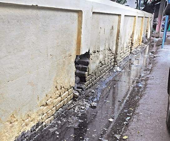 VIJAYAWADA: The dilapidated boundary wall of Karnati Rammohan Rao Municipal High School was painted without minimum repair works, ahead of Governor Biswabhusan Harichandan’s scheduled visit to the school last weekend. The boundary wall has been in a damaged state for a long time, and may collapse any moment. This puts children playing on the premises and also the public, at huge risk.