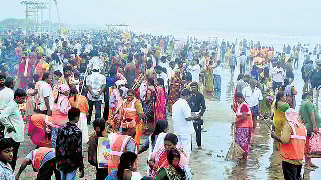 To ensure the safety of the devotees, revenue and police officials monitored the crowds, particularly those bathing in the sea. Police and trained swimmers were on alert to prevent accidents.