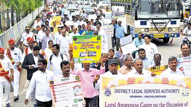 The rally, which began at the District Court complex and concluded at the bus stand, also featured a human chain and anti-drug slogans to raise public awareness. Senior Civil Judge KV Ramakrishnayya, Machilipatnam Bar Association President Pothuraju, advocates, and students took part.