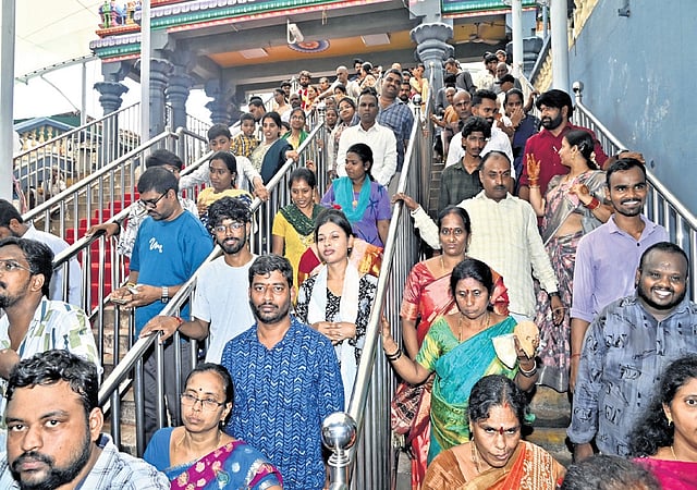 VIJAYAWADA: A heavy rush was witnessed at the hill shrine of Indrakeeladri on Sunday, as large numbers of devotees thronged the temple of Goddess Kanaka Durga during consecutive holidays, the wedding season, and summer vacations. Darshan queues were crowded from the early hours, prompting temple authorities to implement crowd management measures.