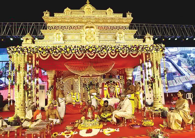The Utsava Idols were placed on the dais, and Vedic scholars performed elaborate rituals amid sacred chants, Mangala vadyams, and devotional music. Before the ceremony, the deities were taken in a traditional procession, allowing devotees to receive divine darshan.