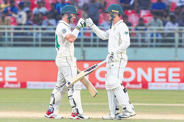 Once Elgar found a way to deal with Ashwin, he didn’t have trouble facing the others. There was a dropped catch off Jadeja — Wriddhiman Saha fluffed it when Elgar was on 74 — but lucky are only those who make their luck count.Of those 45 runs against Ashwin, there was a six that Elgar will remember in the years to come: a slog-sweep that got him to his second ton in Asia. Everyone in his dressing room gave a standing applause. Joining them on the field was Ashwin.