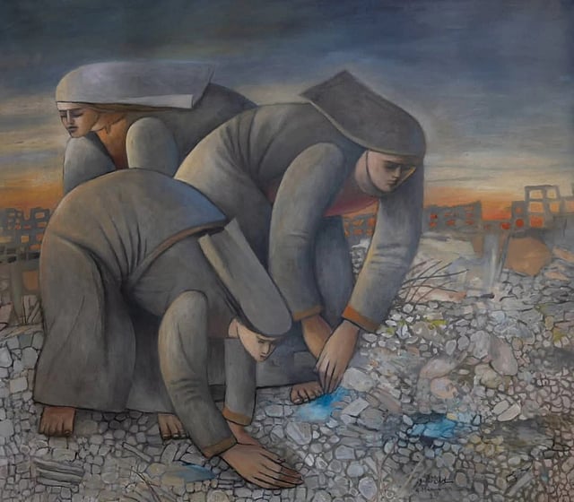 Sliman Mansour, whose work has come to symbolise Palestinian national identity and communal resilience, presents Searching for life, an oil on canvas depicting women salvaging the remains of shattered homes and histories. “This is a powerful work. It has an almost Soviet appeal, being very Constructivist in the manner of building together from ruins,” remarks Aban Raza, an Indian artist.