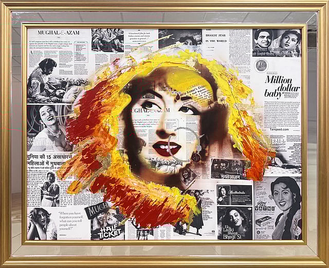 On view were Shiffali Wadhwan’s ‘Agneepath’ which portrayed the fiery pursuit of Amitabh Bachchan’s iconic character Vijay Dinanath Chouhan. The colours of vibrant red, violet and orange were an insignia of the passion that fuelled the charismatic character’s journey. Another work by artist Prasoon Poddar portrayed Bachchan’s cult film Deewar. It showed how his poster — which remains intact while the adjacent posters decay in public spaces — is a beacon of hope amid societal ruin where human activities harm the environment. We moved towards another stunning canvas in mixed media done by Surita Tandon titled ‘Queen of Hearts’, aptly dedicated to actor Madhubala. “I have shown Madhubala as Anarkali, vividly splashed with yellow and orange against a monochrome backdrop. I have hand-embroidered the crystal nose ring to add a touch of glamour. Her eyes are painted to reflect the depth and expressiveness that she carried with her gaze,” Tandon told TMS at the show.