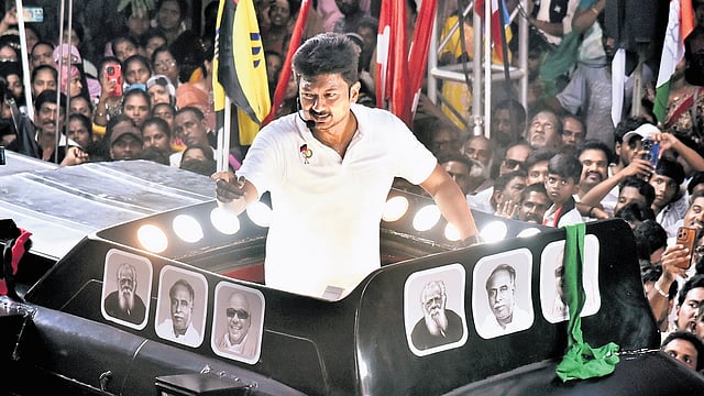 In stark contrast, while pitching for Dravidian model 2.O regime, 48-year-old Udhayanidhi goes around appealing to the electorate as "Grandson of M Karunanidhi, son of M K Stalin, on my own behalf and as your "chella pillai" (your fond child) for a decisive victory to the DMK."
