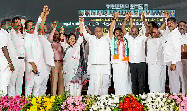 Kharge reiterated key promises made by the alliance for Tamil Nadu, including monthly financial assistance for women and senior citizens, enhanced support for food security, and a commitment to fill all government vacancies within 300 days.