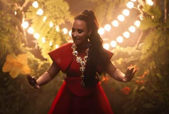The music video opens with Lovato donning a red gown while belting out the song against a backdrop of lush grass and blue skies.