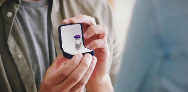 This parody advertisement of the Pfizer vaccination describes it as the 'one shot at the perfect gift' for valentine's day.
