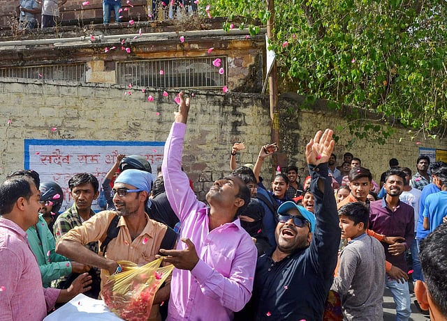 Fans celebrate bail granted to Salman outside his residence in Mumbai.