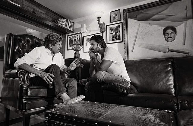 It looks like Ranveer has developed more fondness for Kapil as he sits cross-legged on a couch listening to the legend carefully. The monochrome image in the backdrop has a big-framed pictured of Kapil Dev holding a bat.
