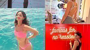 Another picture shows Ananya in a black tank top and matching flared denims, posing with a sign board that reads: "Famous for no reason".