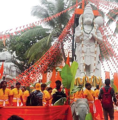 The track dedicated to lord Hanuman is also high on star value because it will feature Darshan, and Arjun Sarja's nephews Chiranjeevi Sarja and Dhruva Sarja.The song is currently being shot in Bengaluru in front of a huge Hanuman idol. City Express got hold of a few photographs from the saffron-coloured sets, and we spotted actor and director, Arjun Sarja, donning a kurta wtih jai sri ram printed on it. Dhruva is an ardent devotee of lord Hanuman like his uncle. We hear Darshan and Chiranjeevi Sarja to join the sets from today.