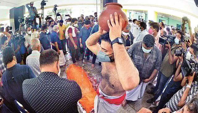 Actor Vineeth who paid his last respects couldn’t hide his tears; actor Alencier stood silent for minutes after paying tribute. The body was taken to Santhi Kavadam by 1.45pm. The men in uniform offered gun salute as per protocol. Soon, final rites began. Unni Venu, the elder son of Nedumudi Venu, led the last rites, assisted by Kannan Venu, his younger son.