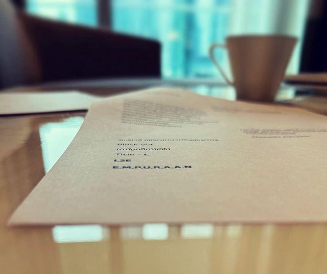 The photo featured Empuraan's script on the work desk beside a coffee mug.