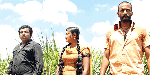 The film opens in a deserted sandy field strewn with buffalo heads and horns, suggesting a place which has witnessed gory killings earlier. Thug Drona (Sampath) threateningly holds a weapon to the neck of a young girl (Smita, adequate in her debut), and taunts Karna the protagonist to retrieve her from him. It’s a flash to the past and to the happenings that had led to the present stand-off. There is Drona kidnapping the girl with the intention of marrying her, on the advice of his astrologer (Tinnu); of her taking refuge with Karna, a man with a social conscience, but an eccentric and a loner; Drona’s search for her and taking her back; Karna’s hot pursuit and the showdown between the two men. The movie has a non-linear plot. There are other players too who fit in suitably, like the corrupt cops on Drona’s side, and the groups for and against Karna. The suspense element has been well maintained. There is no forced humour or romance. The screenplay has been meticulously etched and the director has been able to maintain a uniformity and consistency throughout. The slow motion shots though at times do affect its pace. A little more work on the story -line would have worked to the film’s advantage. Satyan who plays Karna’s man Friday, makes us both laugh and earns our sympathy.