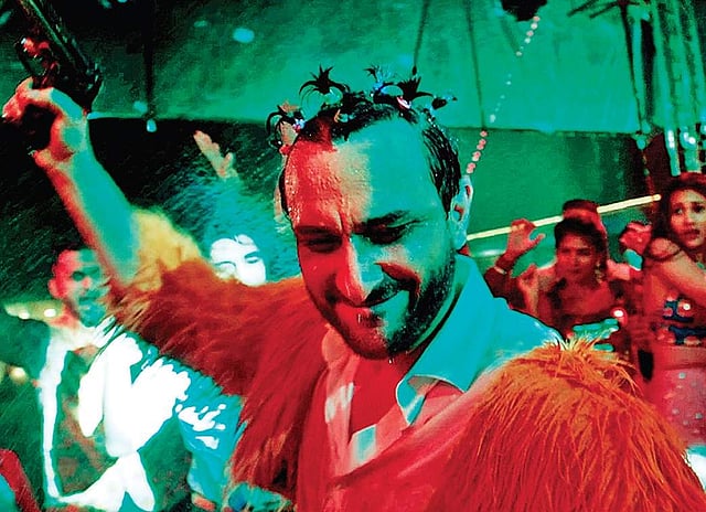 Saif displays the required range of emotions associated with such an encounter rather deftly. After some advice about getting his affairs in order, Rileen leaves for home. His brother, Angad, is on the verge of getting married. The house is decked to the rafters, with the shaadi spirit pervading the place. The seemingly strait-laced Rileen, who has but a few months left, is ready to experiment, to try the things he has rejected for so long. While the party rages on, he asks his cousin for some drugs, determined to feel something other than despair. Initially reluctant, the cousin finally offers him LSD. Rileen pops the red star in his mouth and heads off to take Angad for an overdue haircut. Angad has just received a call from a former flame, and is unable to think straight.
