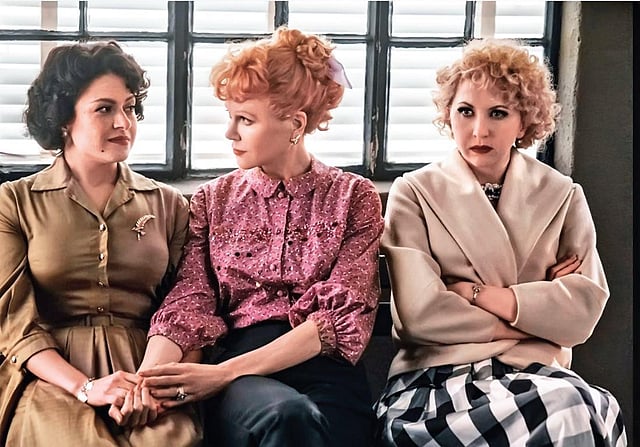It all begins with a scandal that strikes the Ricardos when Desi is captured with a stunning lady and a tabloid prints speculations of his affair. Desi and Lucy try to make up by making out, but soon, a voice on the radio cries that Lucile Ball is a Communist. This is a revelation that could potentially alter her life. All this is enough to bring about enough tension in their relationship. And yet, Sorkin throws in conflict after conflict, including offscreen dynamics and Lucy’s pregnancy among other things.