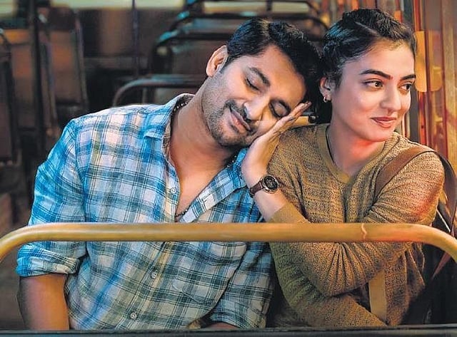 What works are random moments of wit that the film needed more? There’s one scene that I feel is the most important in the film — the one in which Sundar explains to Thomas (Azagham Perumal) why he staged a drama to get married to Leela, and also confesses that he would have lived in guilt had the latter not slapped him for messing up things — it’s a poignant and delicate scene because Sundar is truthful, comforting and hopeful. It also works because it’s performed instinctively by Nani and Perumal. Vivek Athreya scripts a smart in-joke into a scene where Sundar is being coerced by his conservative father (Naresh VK) to follow his superstitious beliefs.