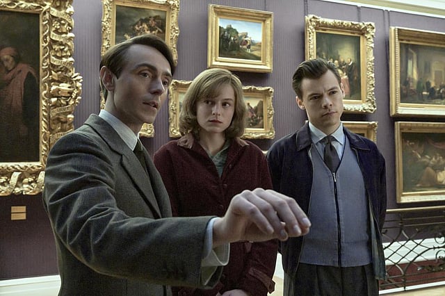 Now we flash back to the 1950s, with the younger Tom (Styles), soft-spoken but devilishly handsome, wooing the winsome Marion (Emma Corrin, a memorable Princess Diana in “The Crown” and well-cast here) by teaching her how to swim. It’s a chaste courtship. One day Tom invites Marion, a schoolteacher who loves art, to a private gallery tour, courtesy of a curator he’s met while out on his beat. This young curator is Patrick, and he’s all the things Tom isn’t: intellectual, worldly, highly cultured.