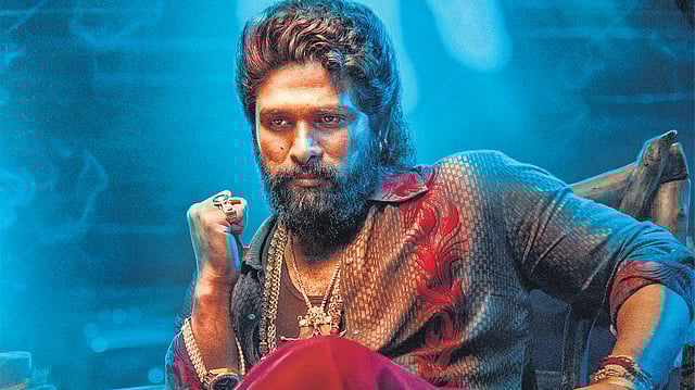 Sukumar conjures unforgettable visuals: a helicopter carrying a sofa, a shot pulling back from policemen to Pushpa’s gang hauling sacks of cash, or Pushpa lifting the pallu of his saree mid-fight. The film shows such taste in reimagining elements from the first instalment, like ‘Thaggedhe le’ and Pushpa’s beard-stroking gesture.