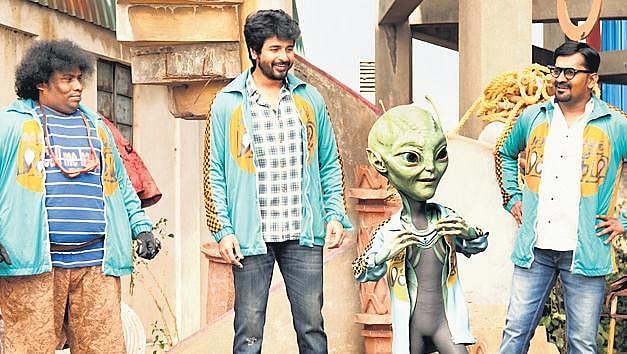 Let us talk about the most striking aspect of the film: The Tropes. The film doesn’t just stick to English films in this area; it liberally borrows from Tamil too. Starting from killing off black people in the opening scene to making a ‘science teacher’ heroine deliver moral science lessons to motivate the hero, the film ticks off a lot of checkboxes across film industries. But, thankfully these hiccups are not deal-breakers as the visuals of Ayalaan and its witty ideas give us enough to munch on and be extra kind with the blemishes. Ravikumar also does effective damage control for his dated portrayals by employing liberal doses of sarcasm and self-awareness. It seems as if he dutifully made a list of dated cliches that annoy us and wrote dialogues to counter them on screen. The director’s idea of taking a dig at his work creates a lot of difference as they make us laugh along with the film rather than laughing at it.