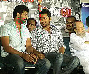 Actor Suriya looking dapper and sporting an earring was the cynosure of all eyes at the recent audio launch of Malai Malai at Sathyam Cinemas. This film by Feather Touch Entertainments will see the re-emergence of actor Arun Vijay. The cast includes Vedhika, Prakash Raj and Prabhu. Arun Vijay has undergone a make over for the film emerging in a rustic avatar as was evident in the trailer and songs shown.