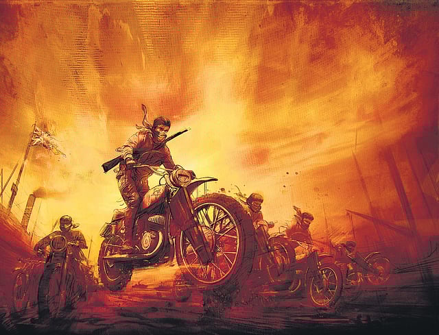 It is already known that actor Dhanush will be teaming up with director Arun Matheswaran for a feature film. The new development is that Sathya Jyothi Films will be bankrolling the project, which is now titled Captain Miller. The first look features Dhanush with his face covered with a mask and riding a motorbike holding a rifle on his shoulder.