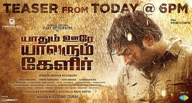The poster features Vijay Sethupathi in different getups. Directed by Venkata Krishna Roghanth, Yaadhum Oore Yaavarum Kelir has Megha Akash play the female lead.