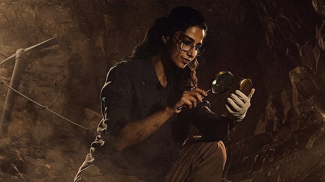 The poster features Meenaakshi at an archaeological site, likely a cave, immersed in her work as she intensely gauges an object with a magnifying glass. The poster caption read, “In the depths of mystery, she unearths the truth. Meet the intensely magnetic @Meenakshiioffl as #Daksha from the world of #NC24.”