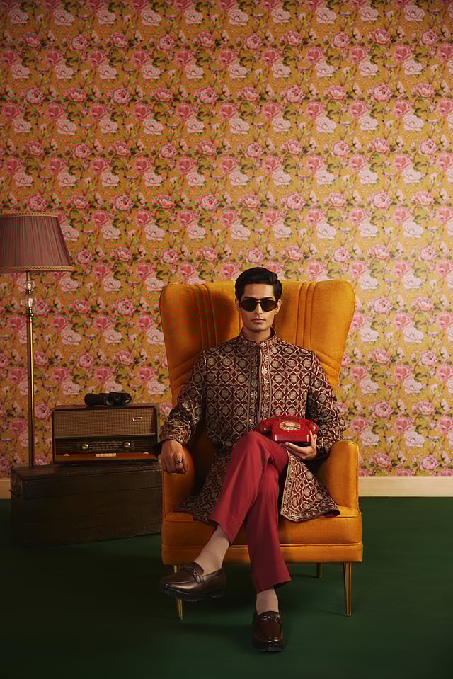 “This collection is designed for men who embrace style as an extension of their personality. Whether it’s a wedding, a festive gathering, or a refined evening soirée, the collection allows wearers to exude confidence while staying rooted in heritage,” he says. Are there any menswear trends that are likely to blow up in the near future? Gupta responds, “Menswear is moving towards expressive elegance, with embroidered ensembles taking centre stage over basic solids. Shawls and stoles are being reimagined as statement accessories, adding depth and flair to every outfit. The future also leans into opulence, where bold cuts and experimental silhouettes redefine traditional classics.”