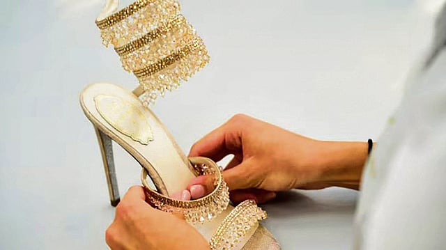 The association which gathered momentum once the celebrated Indian designer and Caovilla met at the Paris Haute Couture Week in January, has resulted in seven brilliant designs - custom-made with Indian textiles and traditional embroidery, and adorned with crystals and refined pendants.
